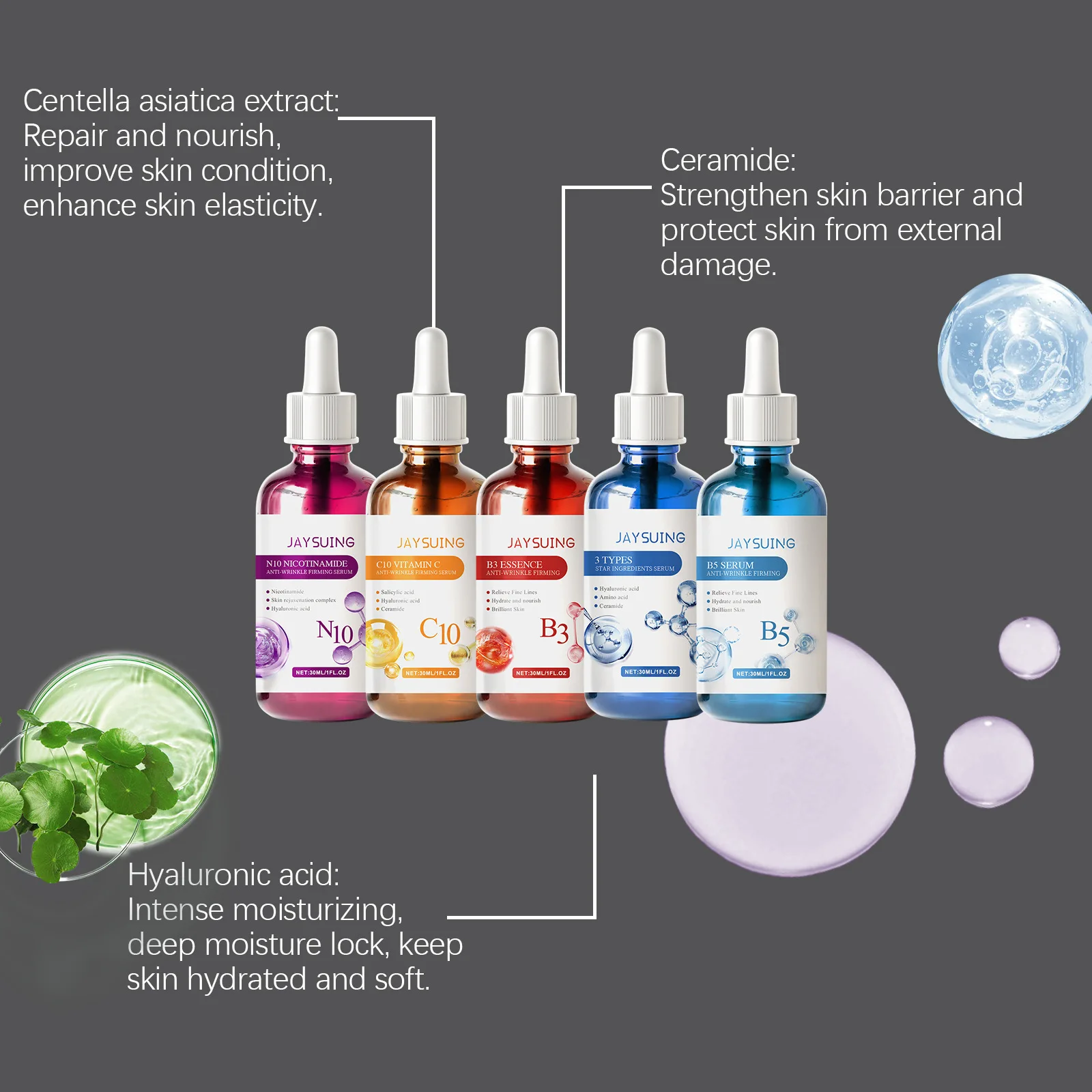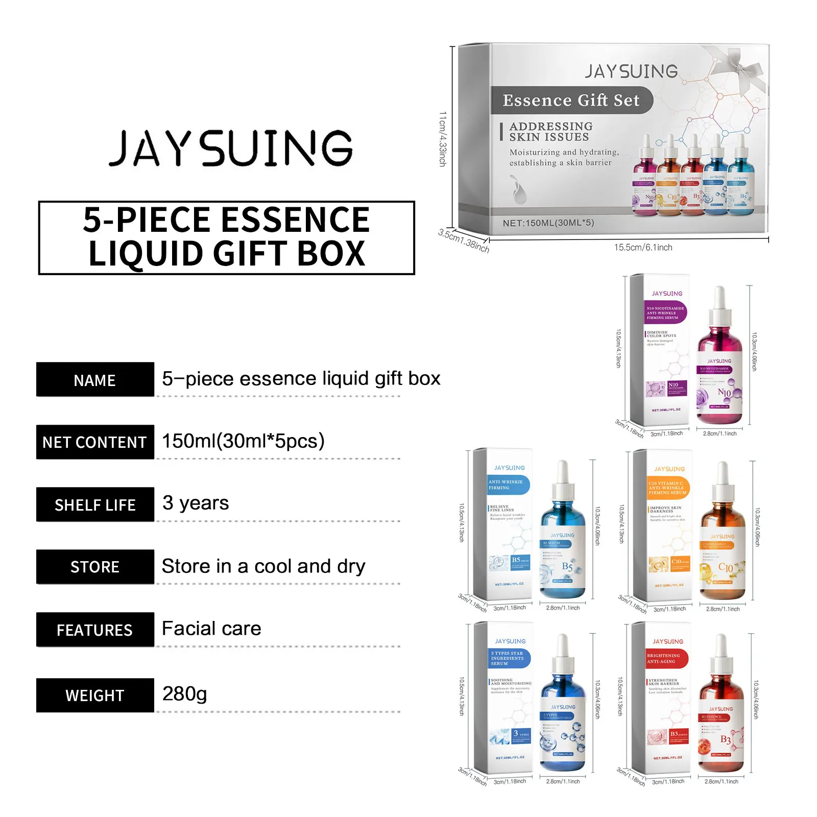 Jaysuing Face Serum Skin Care Sets 5PCS Hyaluron Acid Vitamain C Niacinamide Wrinkle Remove Shrink Pores Moisturizing Brighten B5 Essence 30ml*5pcs