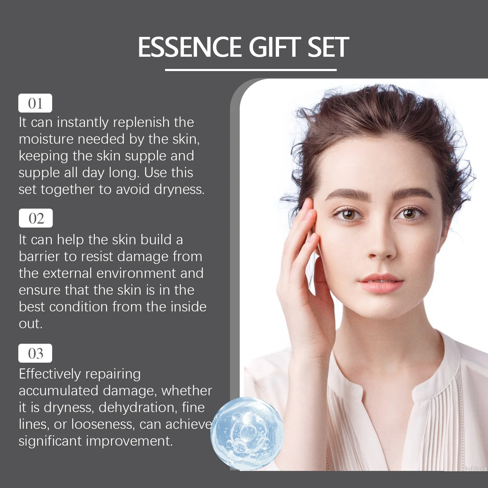 3.3-in-1 moisturizing facial essence formulated with hyaluronic acid,ceramide and centella asiatica extract, ingredients penetrate deep into the muscle base to enhance the water lock and keep the skin moist.