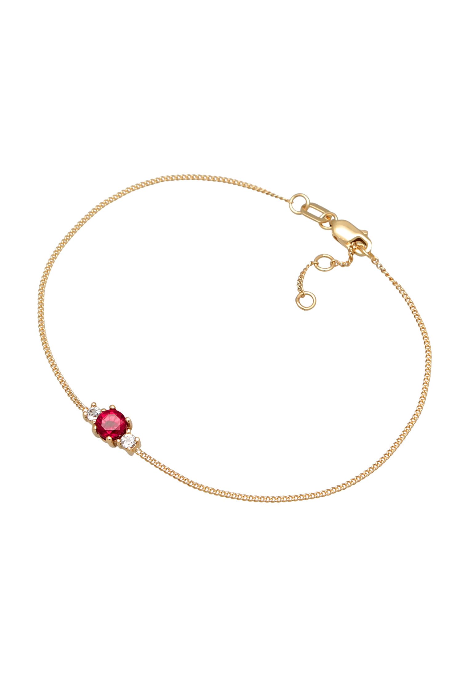 Dieses zierliche Armband aus zarten 375er Gelbgold ist mit einem atemberaubenden, synthetischen Rubin bestückt, der von zwei funkelnden Topas-Edelsteinen untermalt wird. Das Schmuckstück verfügt über 3 Ringe, so dass die Länge verstellbar ist. Ein glamouröses Accessoire, dass das Frauen Handgelenk erstrahlt.