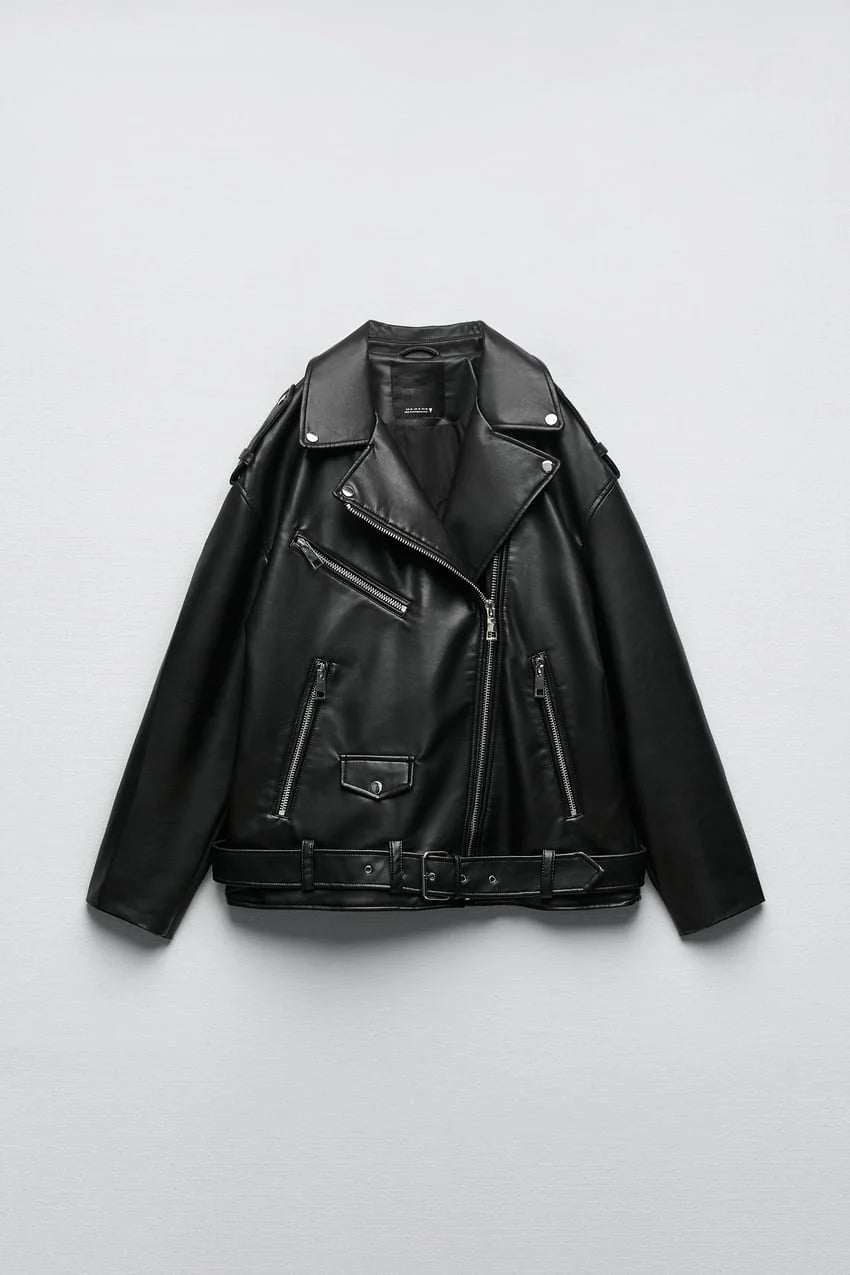 Imitation leather motorcycle loose jacket for ladies new epaulette decoration diagonal zipper down shoulder lazy coat