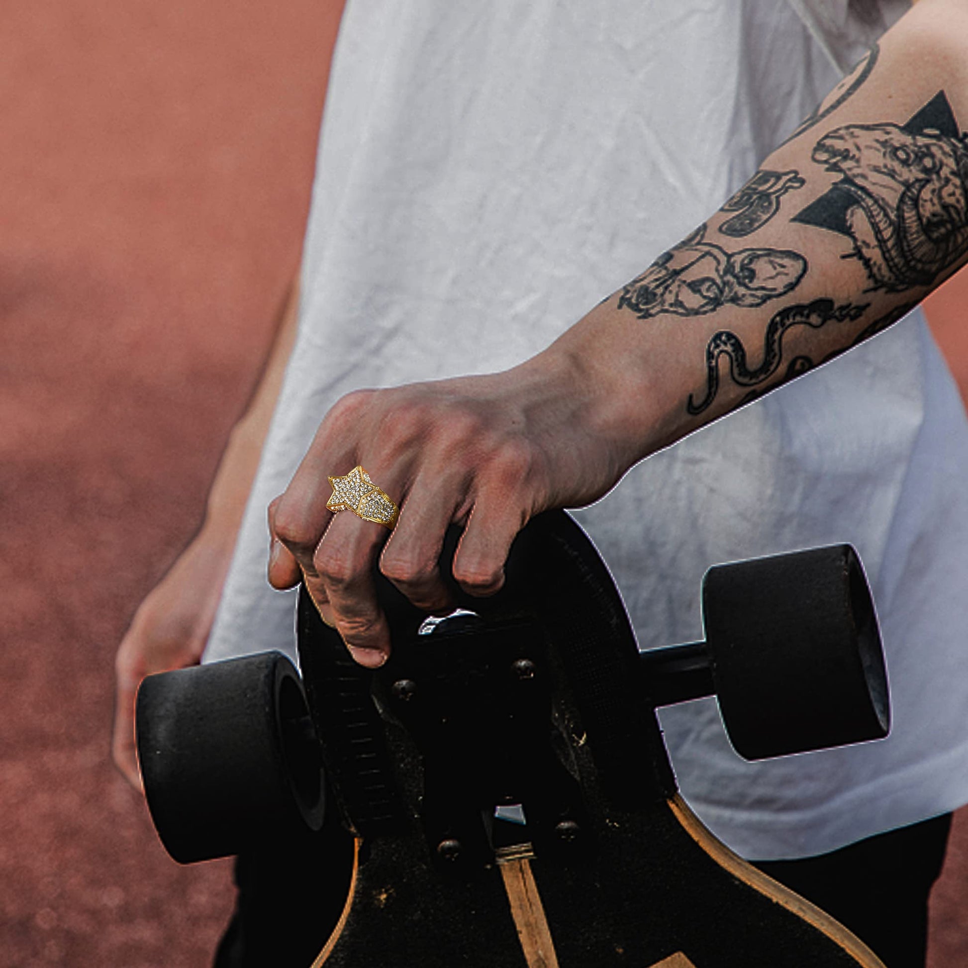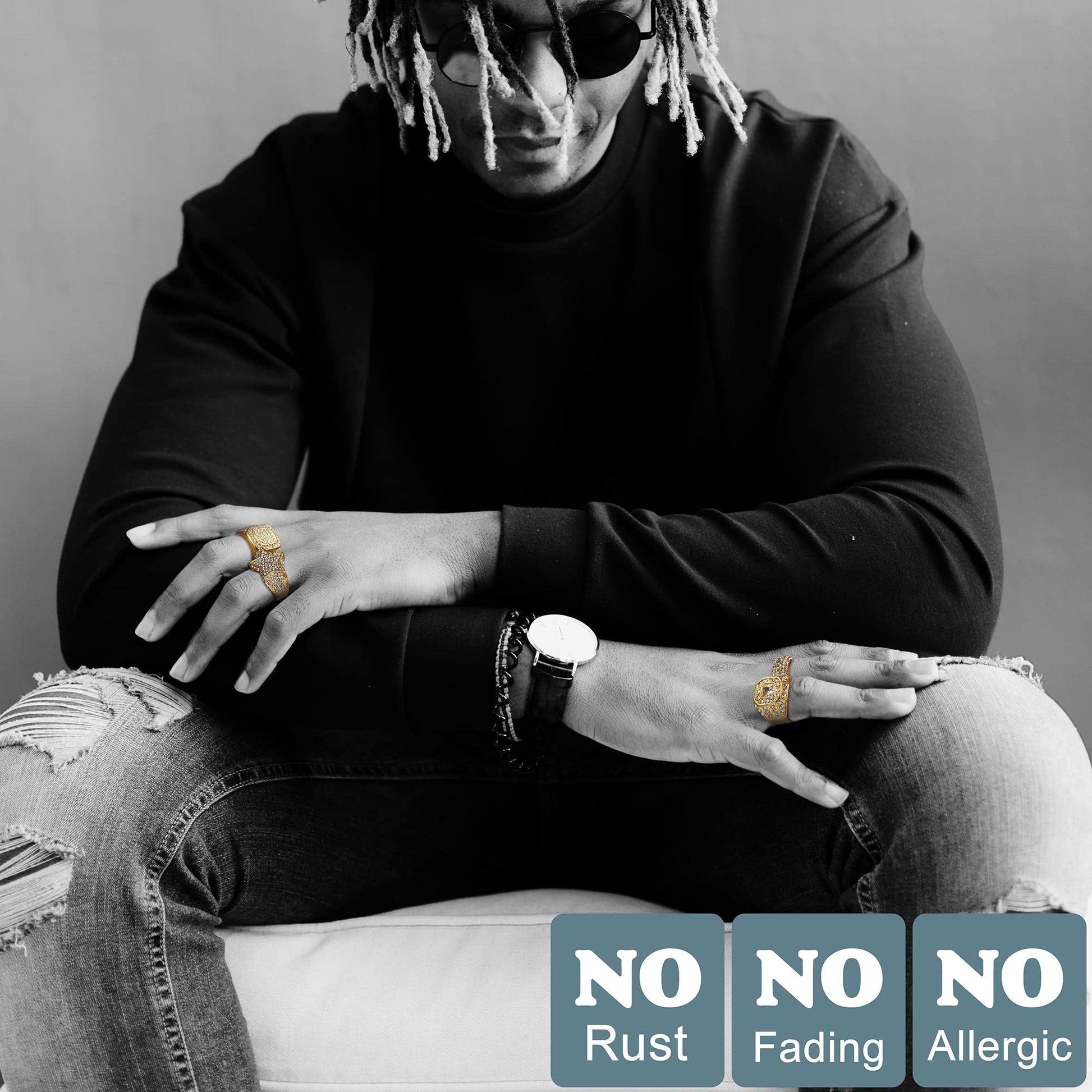 - Iced Out Rings: 6/7/8/9/10/11/12/13 suitable for almost fingers. This rings for men gold are durable and sturdy, high color endurance, advanced plating process, don't worry about hurting your finger, comfortable to wear. You can wear this Iced out pinky rings as an anniversary band, wedding band, eternity band, couple ring, as a stackable ring, or as a right hand fashion ring. If you need some bling accessory for the party when dress like rappers and these were so perfect