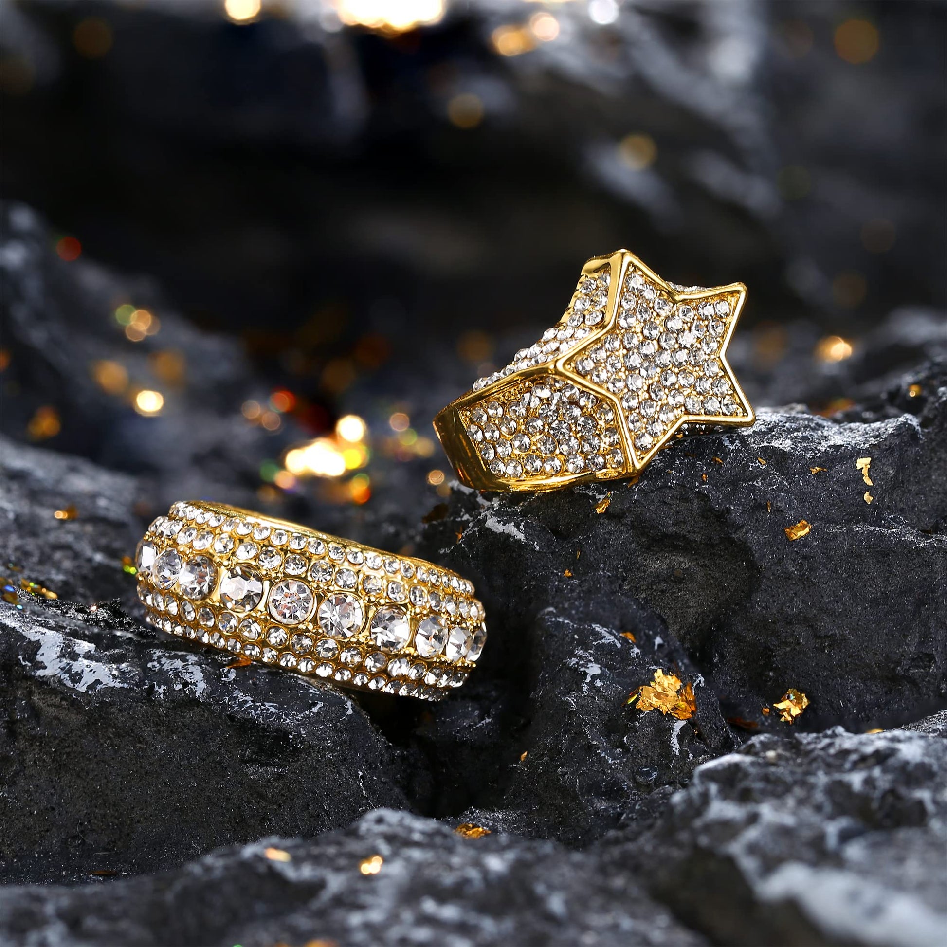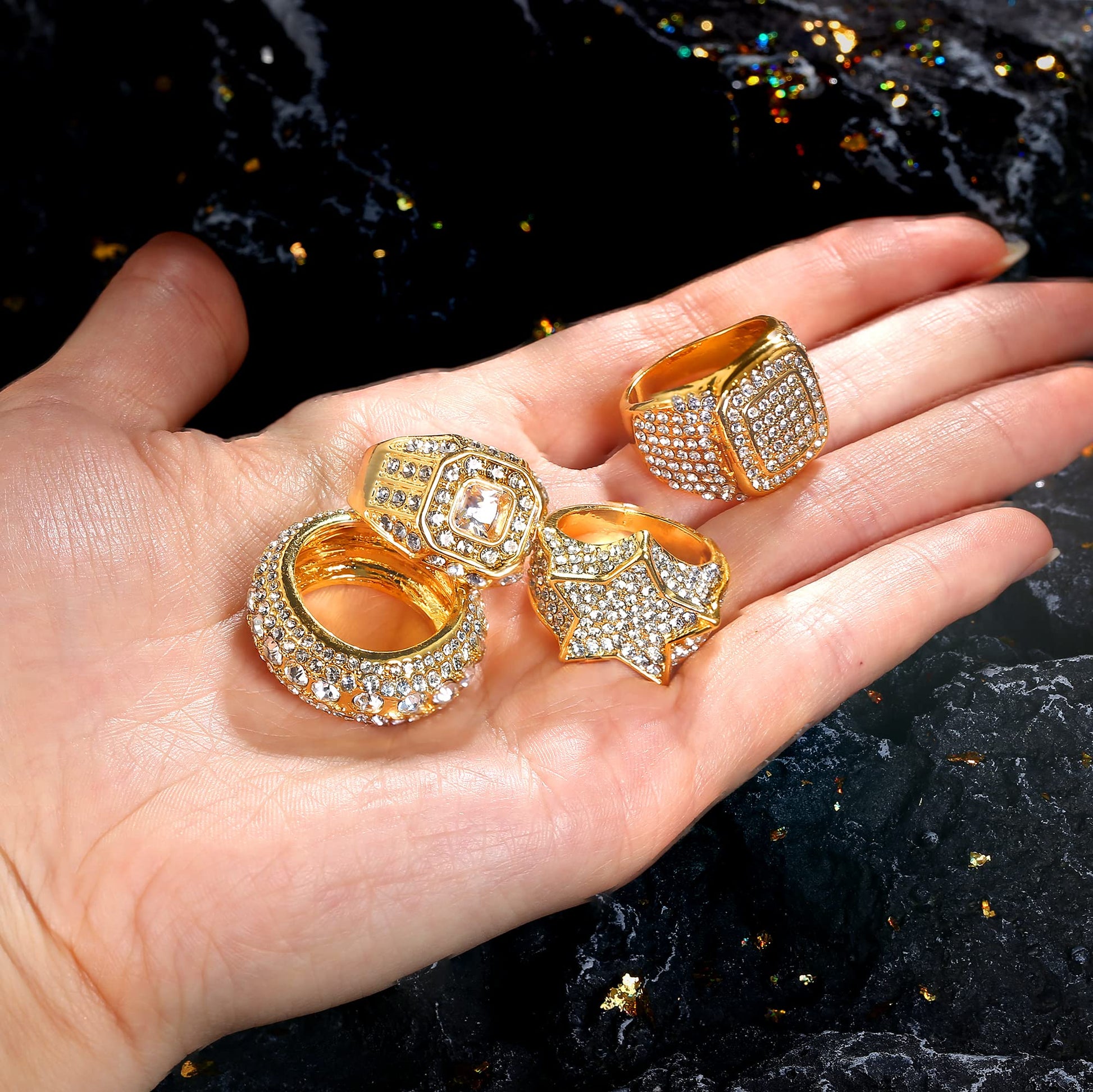 - Hip Hop Rings Set: Each order contain 4 different styles of African fashion rings: iced out hexagram star ring, cz band ring, 5 rows gold pinky ring, oversize hip hop ring. This icy ring suitable for all occasions, various design to match your different matching needs every day. You don't have to worry about how to choose. Now you can have them at the same time