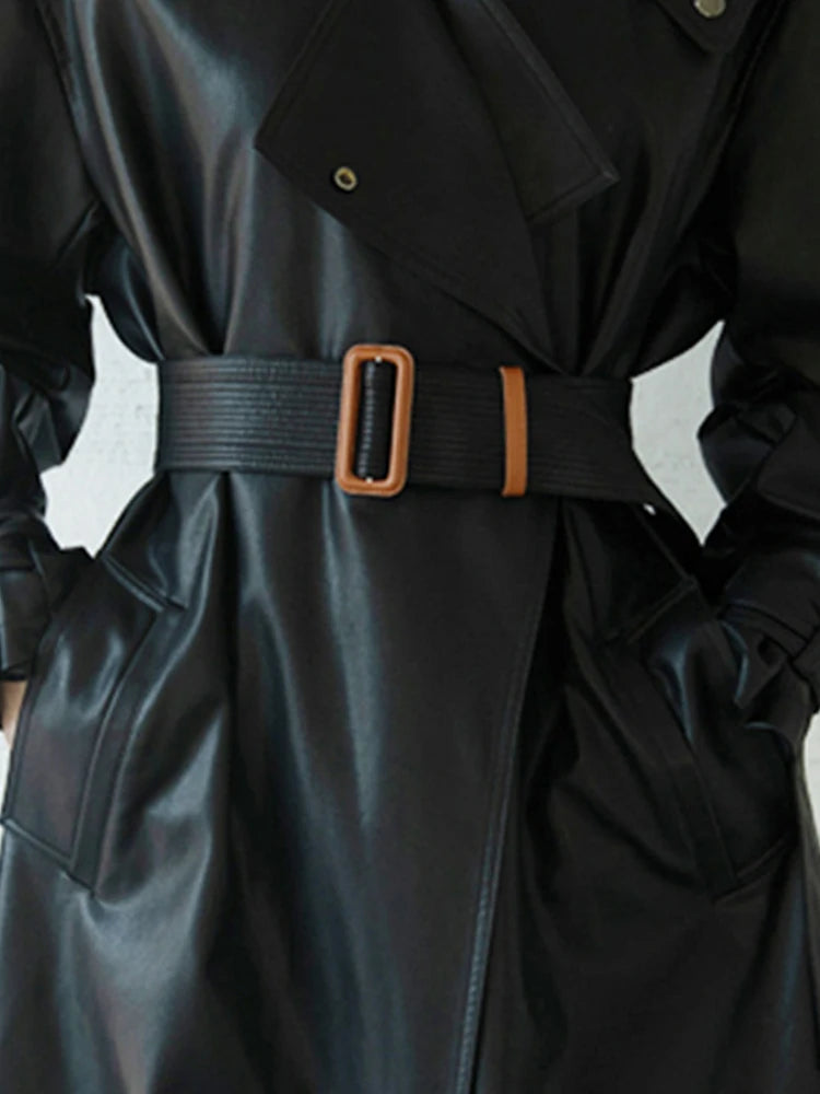 Lautaro Spring Autumn Oversized Cool Black Long Leather Trench Coat for Women Belt Long Sleeve Loose European Fashion 2021 2022