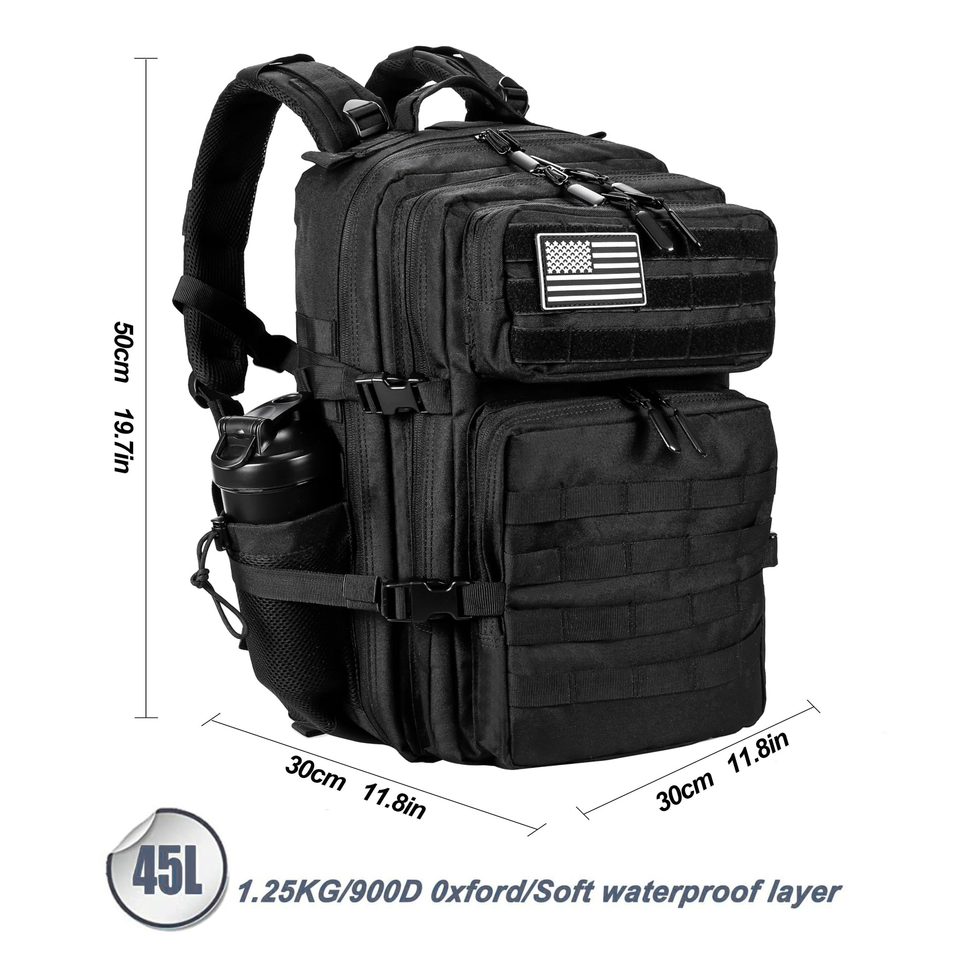 - 1. Military Tactical backpack size approx: 12inch x 20inch x 12inch, Capacity: 45L; Military backpack is made of 900 oxford nylon fabric, durable and water-resistant. Suitable for fitness, travel, hiking, camping, and other outdoor activities.