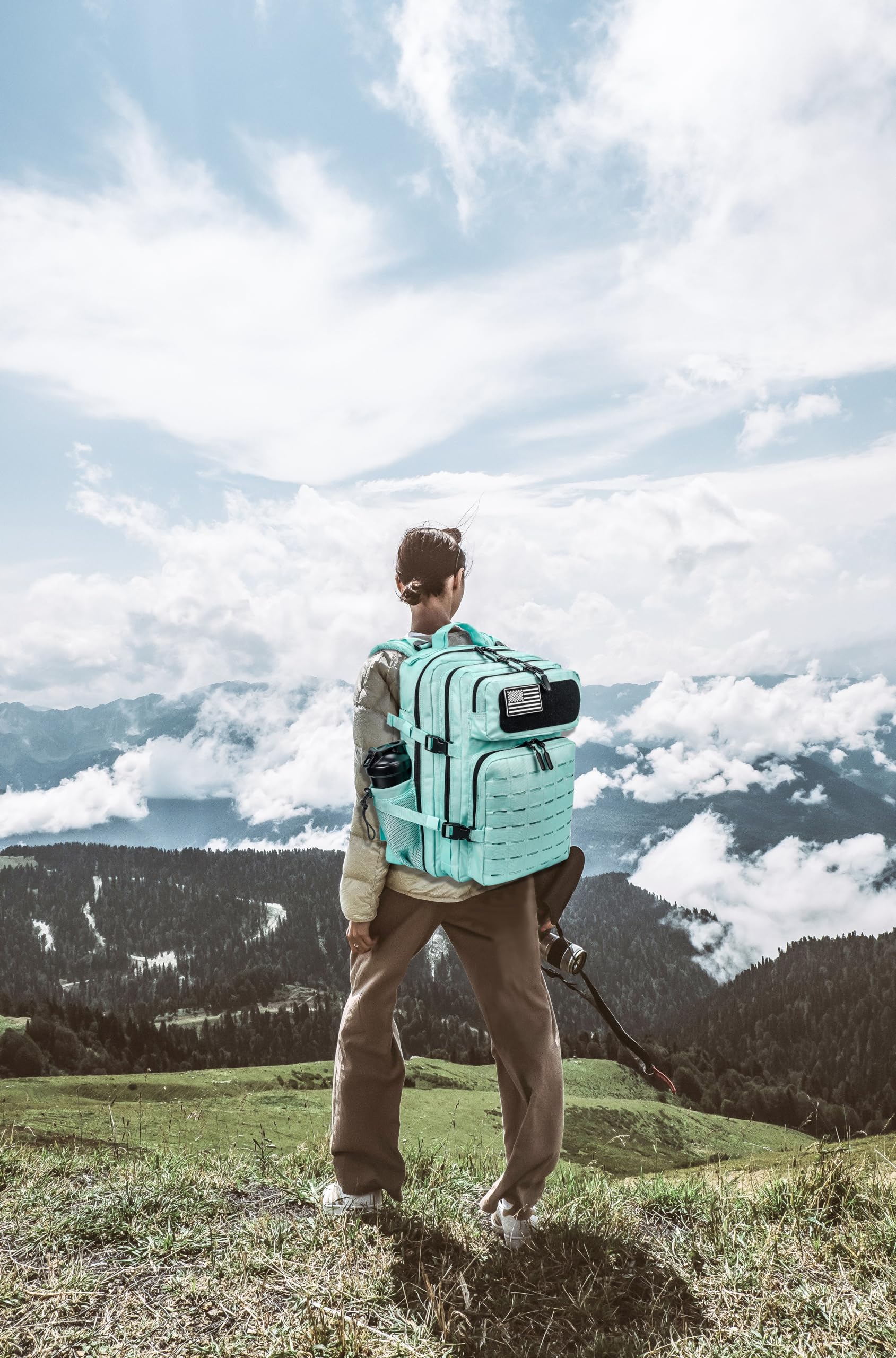 - 3. Functionality: this molle backpack is equipped with a Molle System, allowing you to customize and attach additional pouches and accessories, and this tactical backpack bottom straps allow you to hang a sleeping bag or tent. It also features a double cup holder (water bottles not included) and a water bladder mouth (hydration bladder not included).