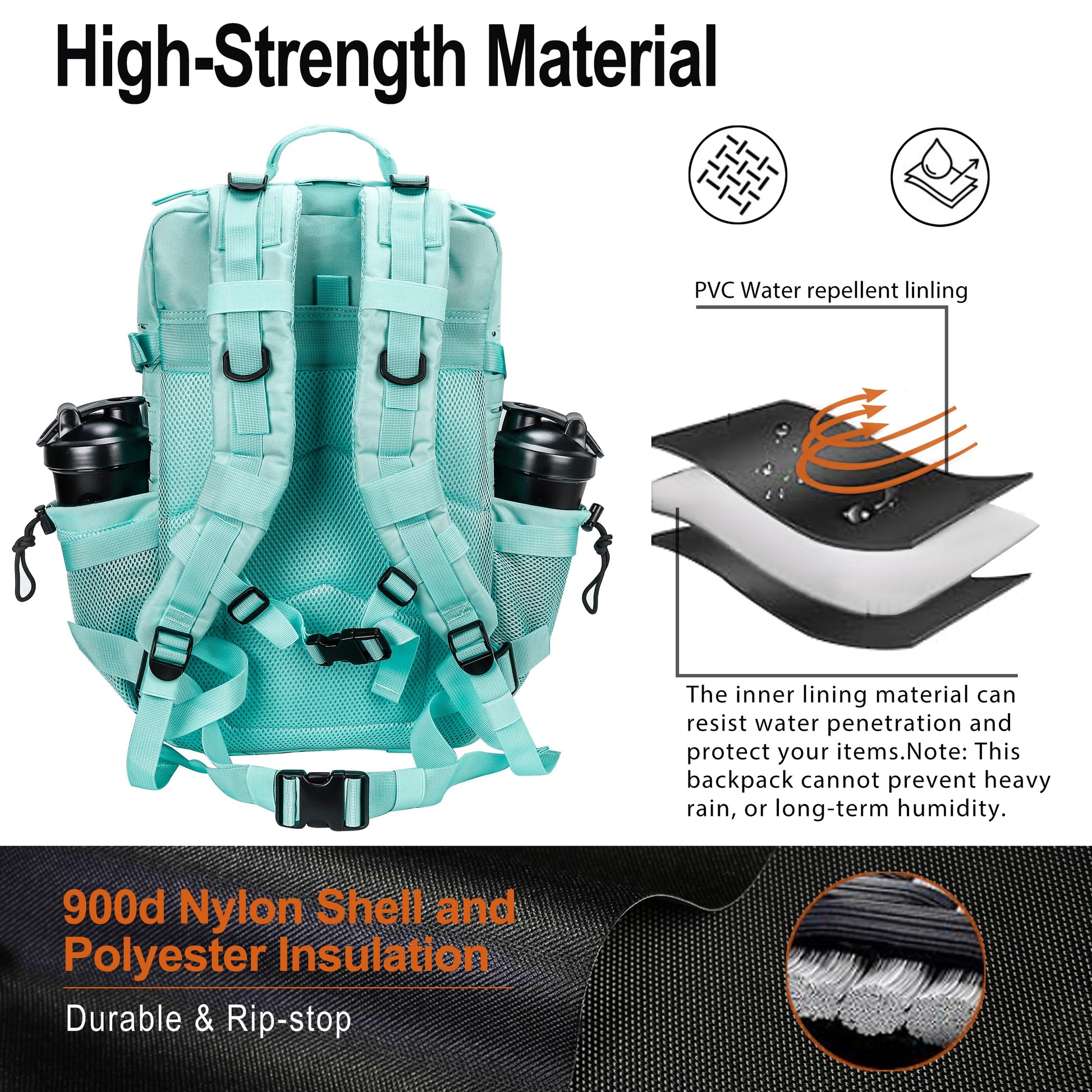 - 2. Durable and Water-repellent: This bug out bag is made of 900D Oxford cloth with a PVC water-repellent lining, and all stress points are reinforced and double-stitched, making it Durable and sturdy.