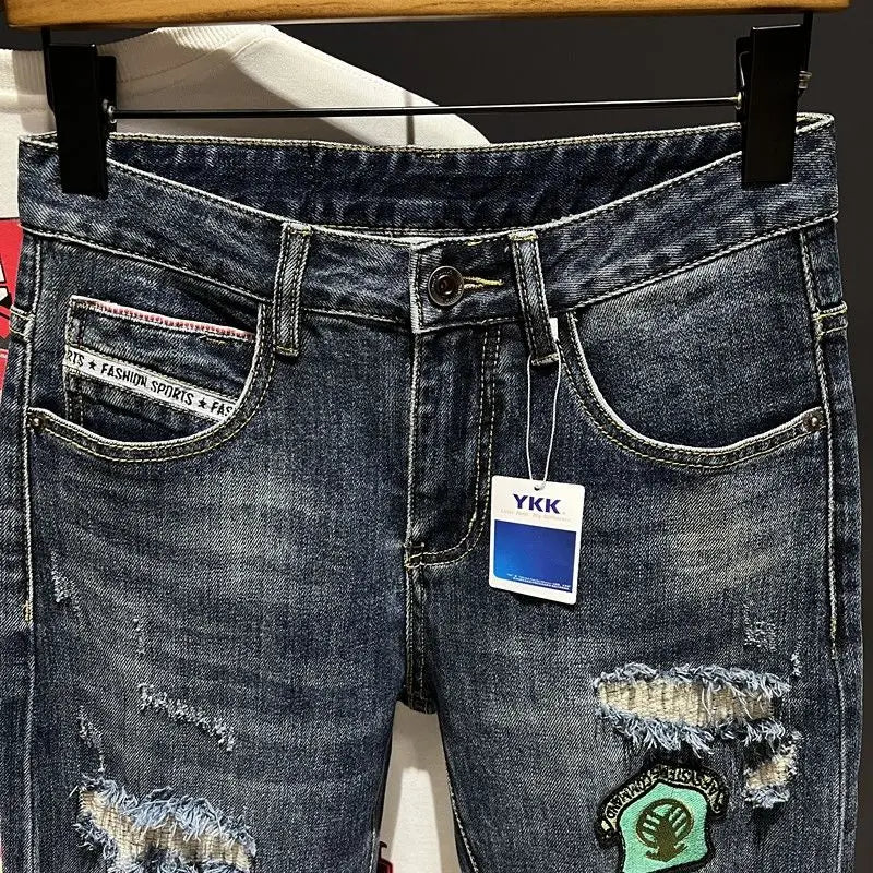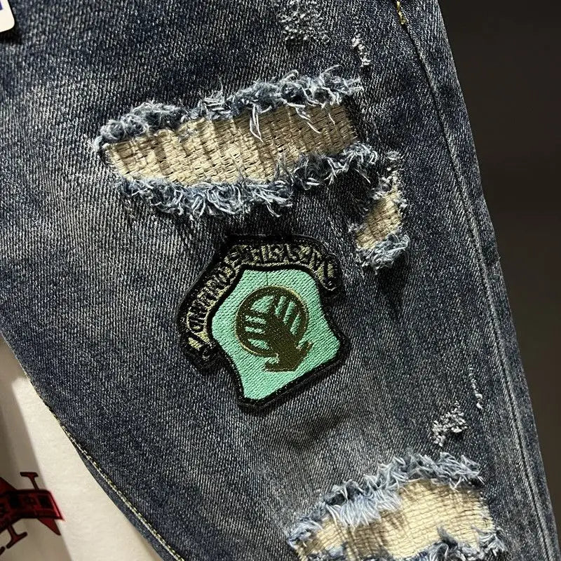 Men's Jeans Broken Tapered Torn with Print Trousers Graphic Retro Korean Fashion Ripped Slim Fit Man Cowboy Pants Designer Holes