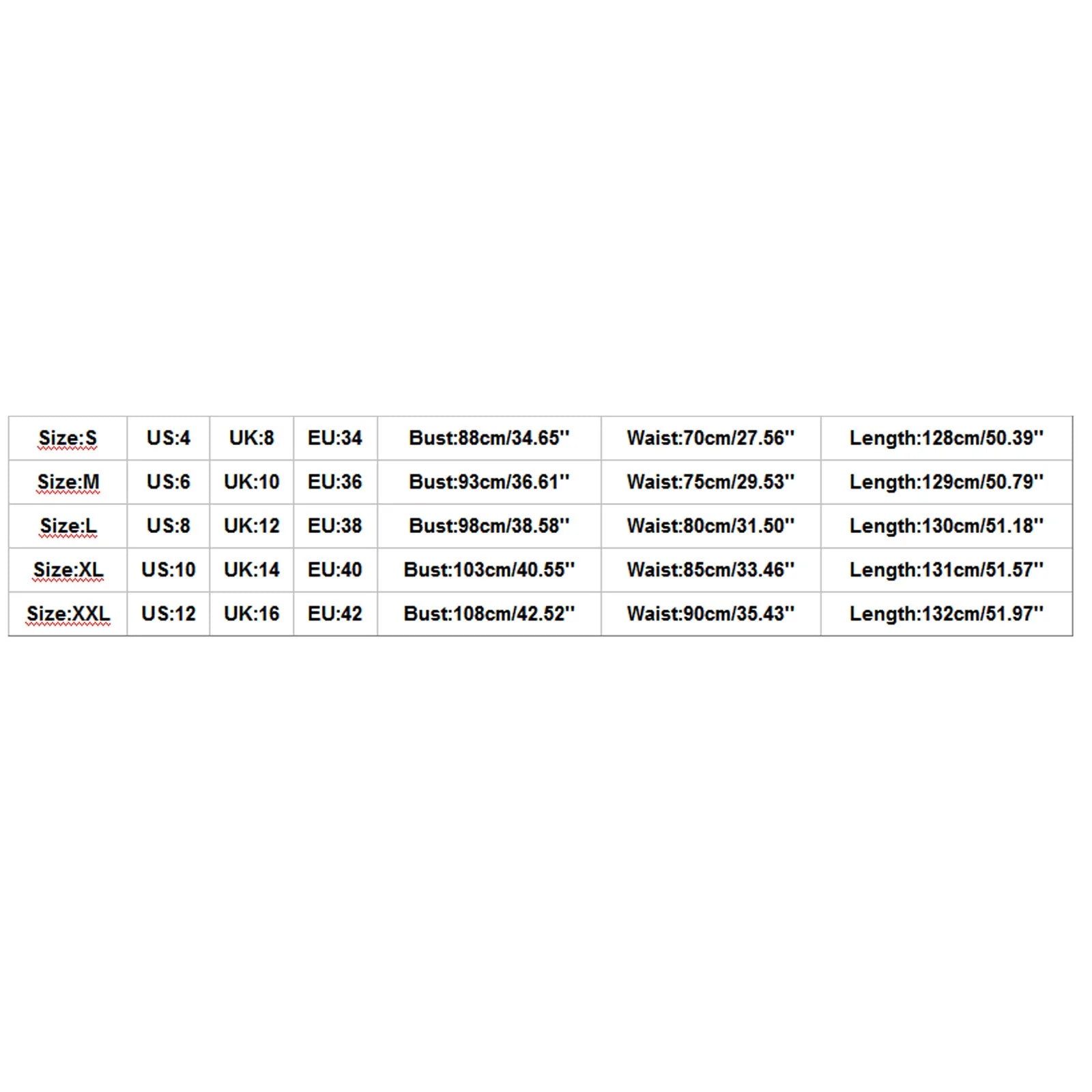 | Size:S | US:4 | UK:8 | EU:34 | Bust:88cm/34.65'' | Waist:70cm/27.56'' | Length:128cm/50.39'' |