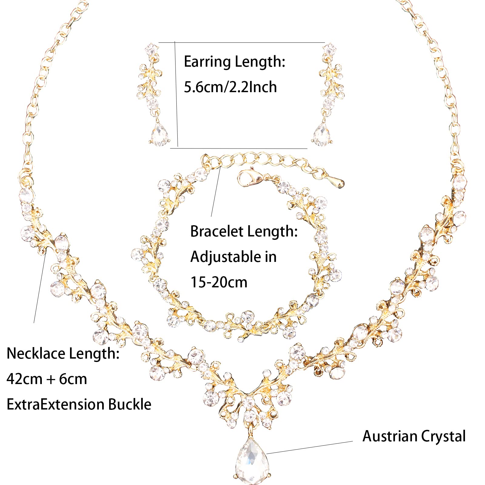 - Specification: Earrings + Necklace + Bracelet, 3 types Jewelry of wedding,Statement Necklace Size:16.5-19 in; Dangle Earrings length:2.2 in; Bracelet length:6-8 in; Lightweight and Comfortable to Wear. Perfect Jewelry Set for Women Ladies.