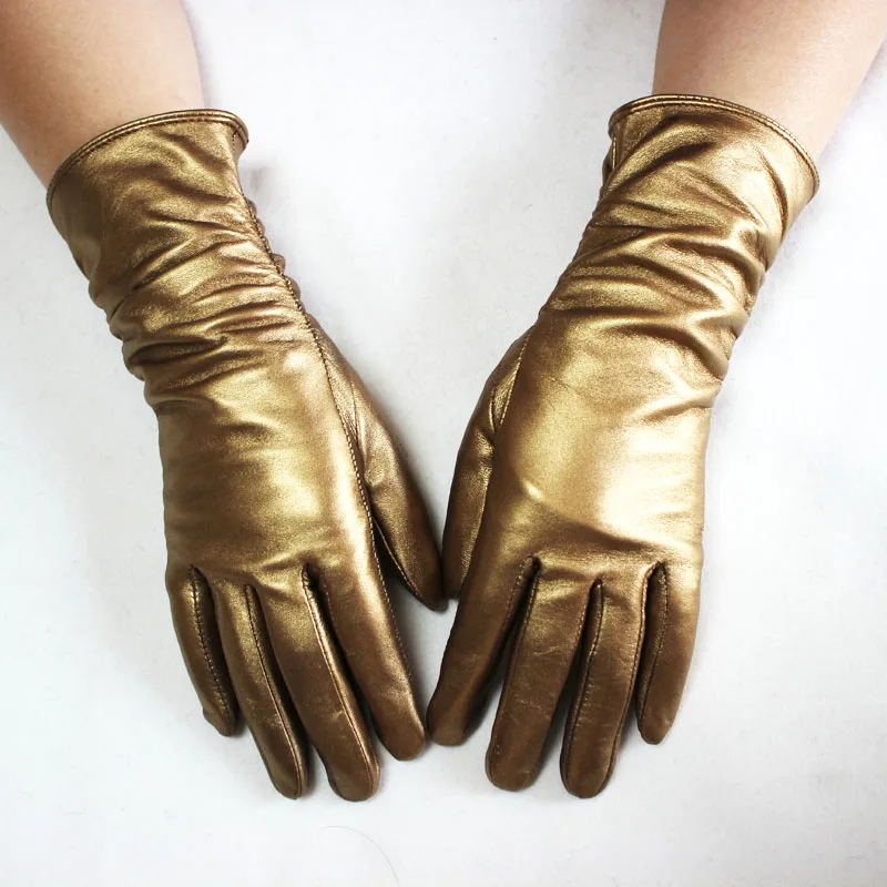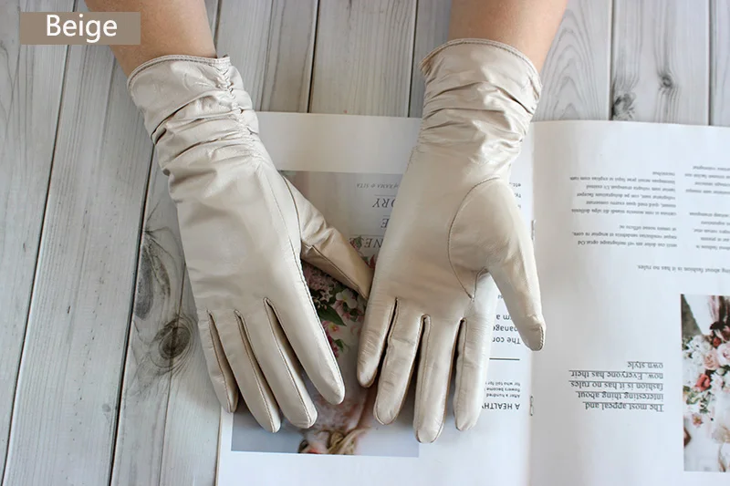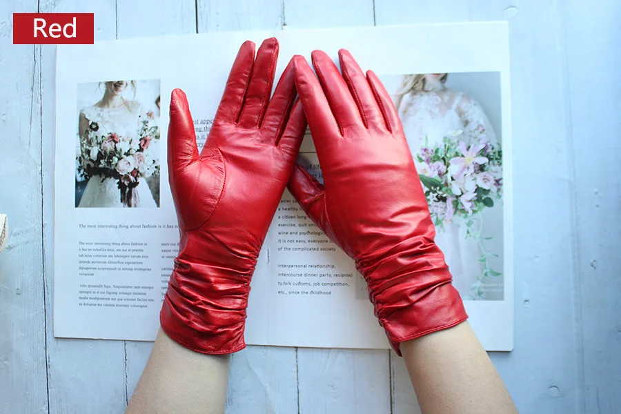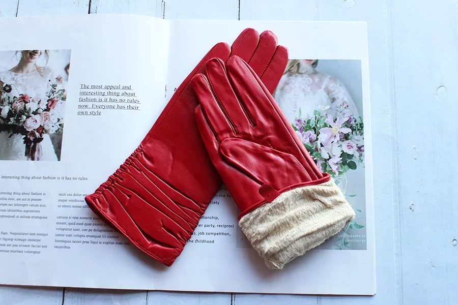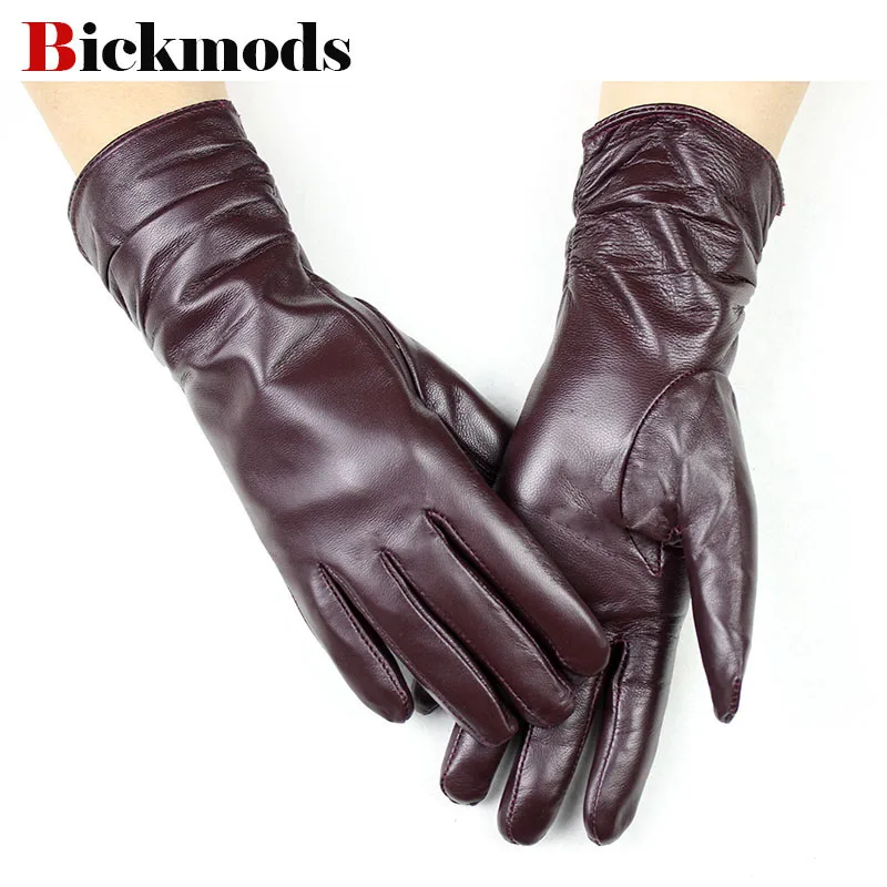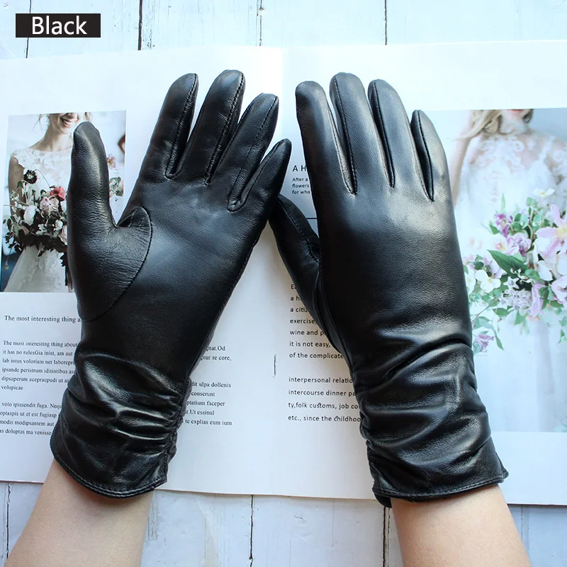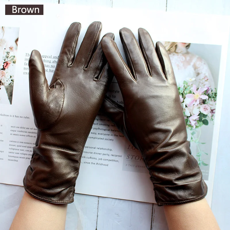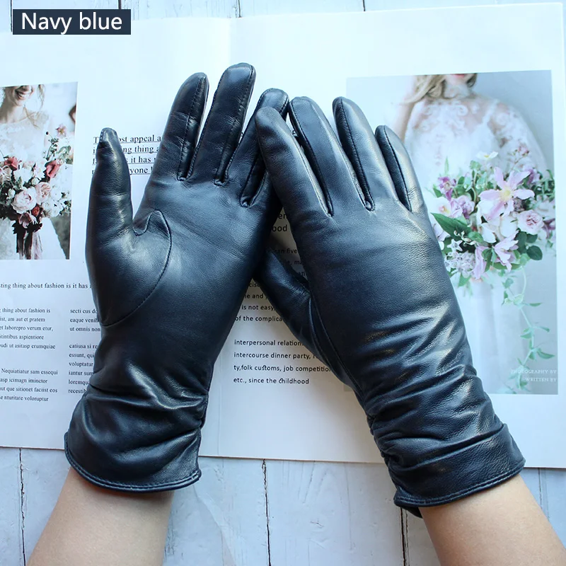 Sheepskin Leather Gloves Women's Fashion Elastic Style Velvet Lining to Keep Warm in Autumn and Winter Retro Color Points
