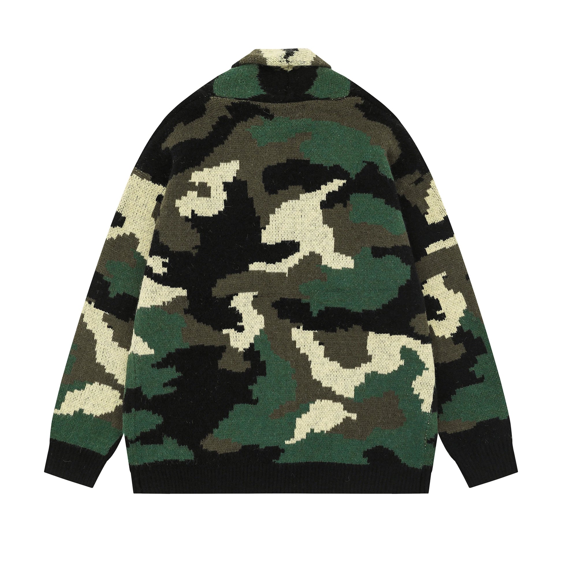 Vintage Camouflage Knitted Cardigan Jacket Autumn and Winter Print Button Stand Collar Knitwear for Men Baggy Sweater Coat
