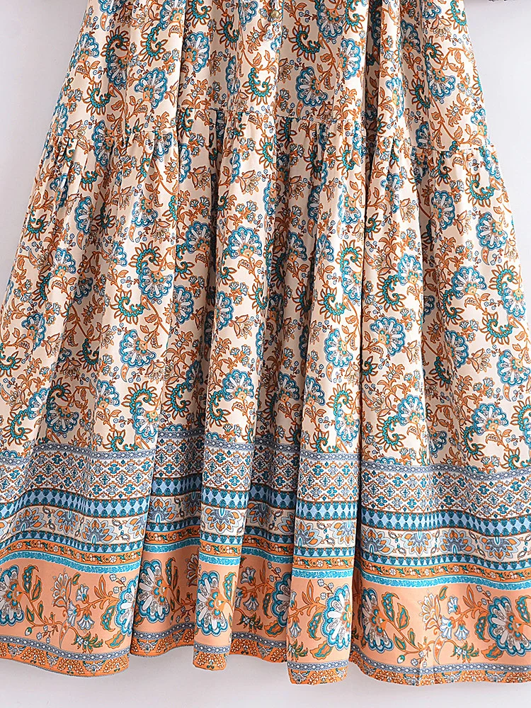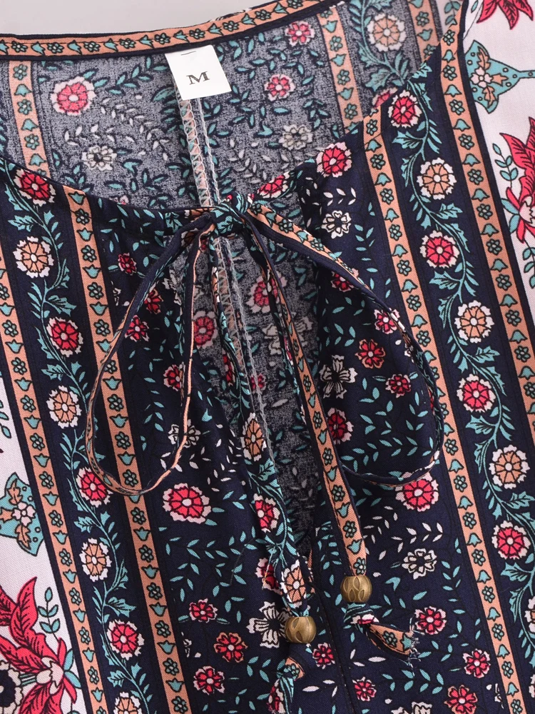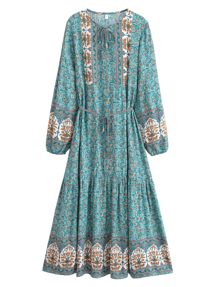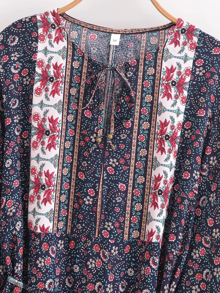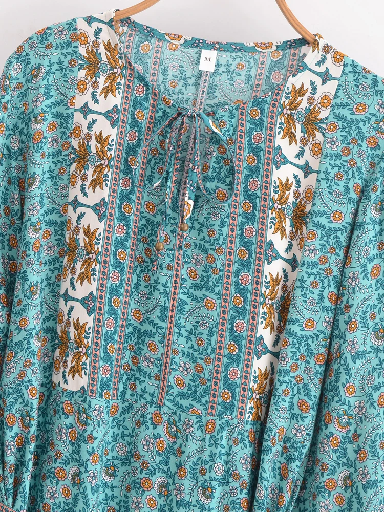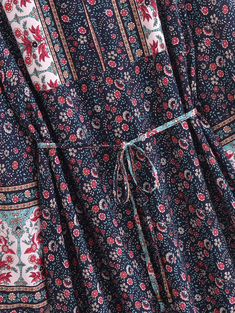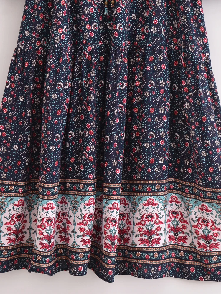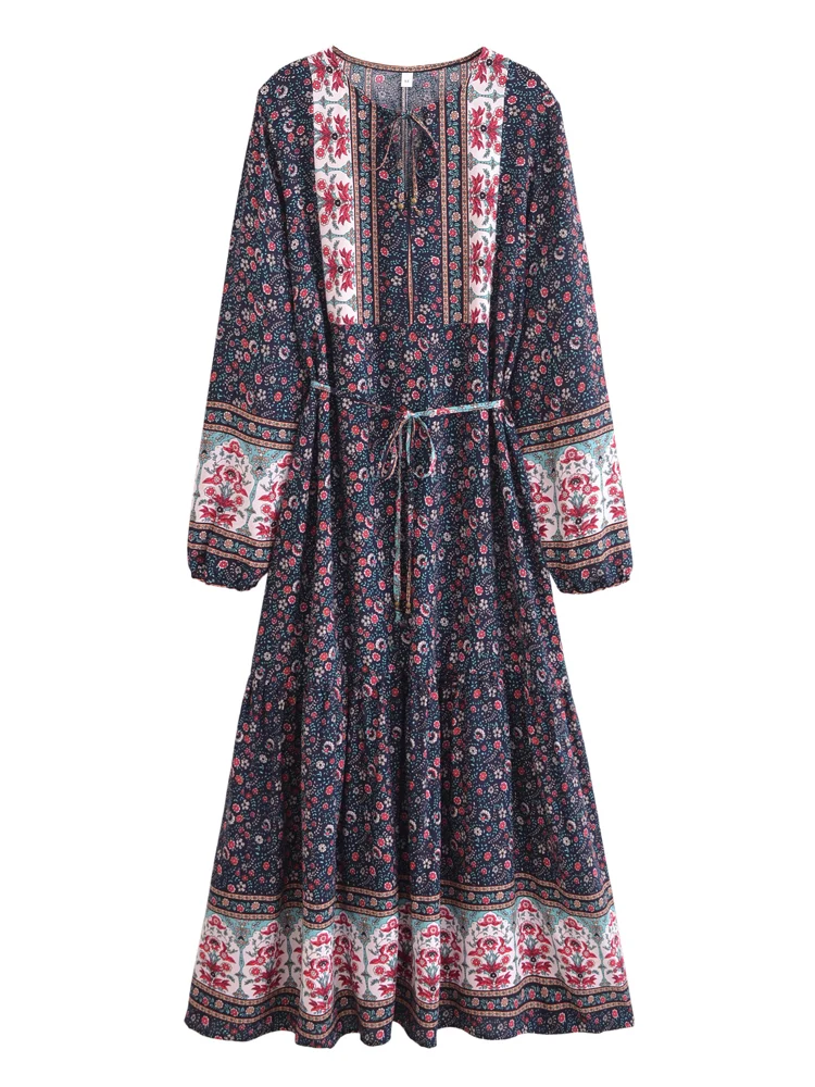 Vintage Chic Women Elegant Lace-up Tassel Floral Print Beach Bohemian Maxi Dresses Robe Ladies Rayon Cotton Boho Dress Vestidos