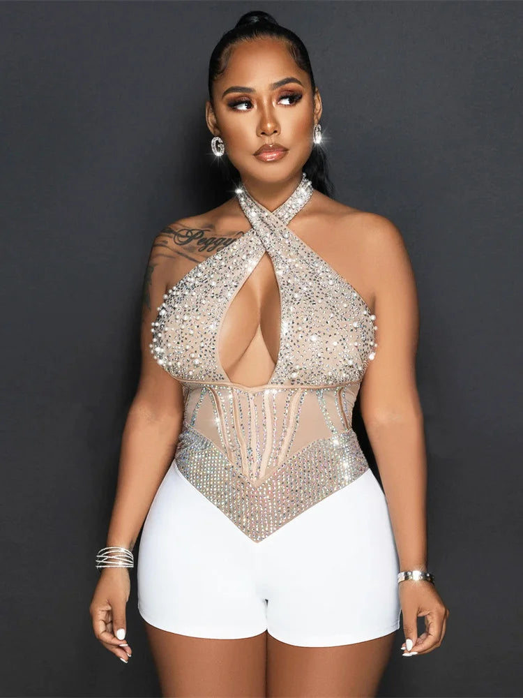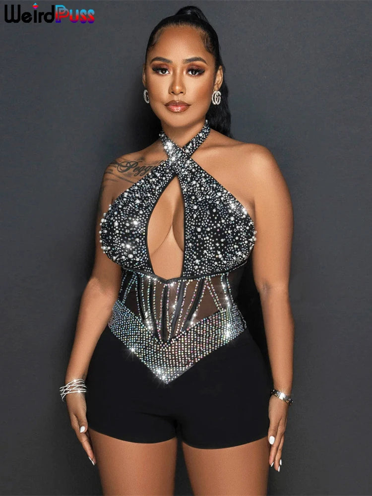 Weird Puss Sequins Halter Women Bodysuit Sparkle Hollow Backless Sleeveless Patchwork Sexy Stage Performance Party Playsuits