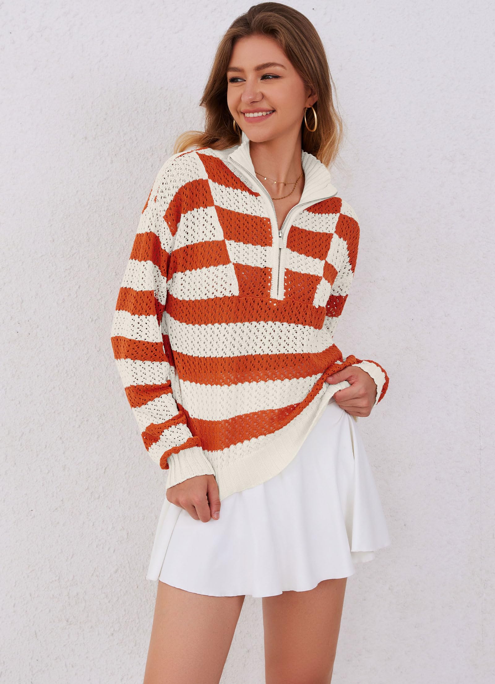 - FEATURES: This fashion fall knit sweater tops feature with v neck, lapel collar, crochet tops, 1/4 half zip up front, long sleeve hollow out top, drop shoulder, stripes style, ribbed cuffs and hem, relaxed fit knitted pullover tunic sweaters, simple but elegant, never out of style