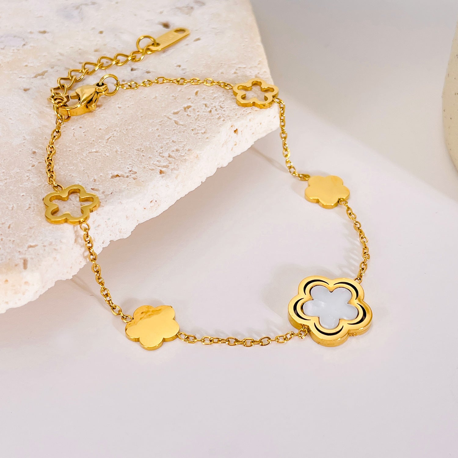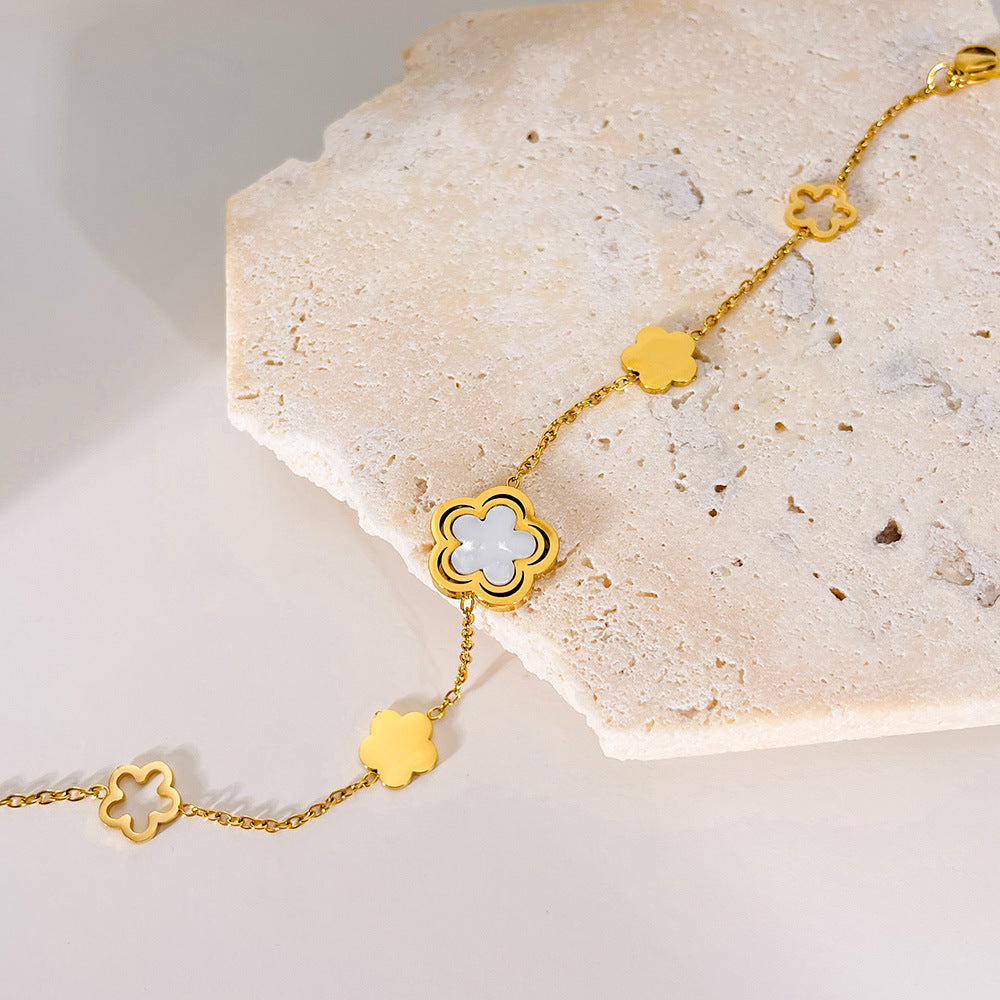 Women's Stainless Steel Hollow Five Petal Flower Mother Shell Bracelet