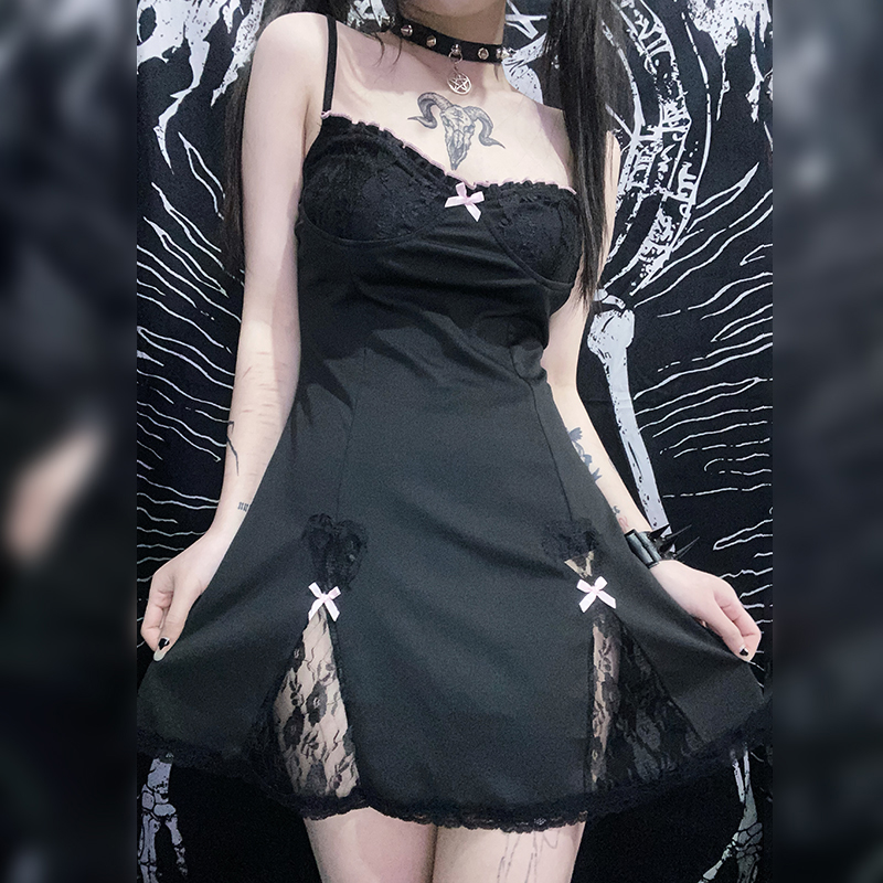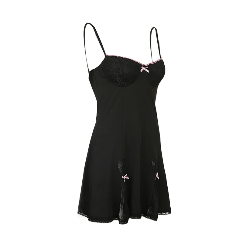 y2k Black Mini Dress Cute Sweet Girl Lace Trim Outfits Sleeveless V Neck Dresses with Bow 2000s Aesthetic Goth Clothes
